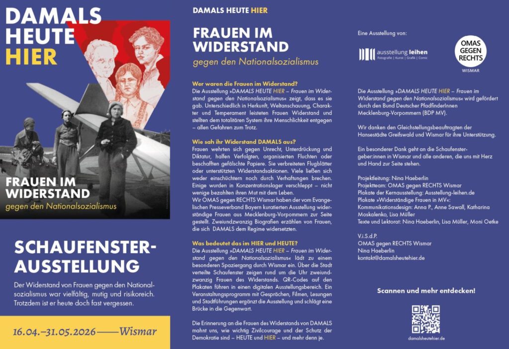 Seit dem 16.04. 2026 sind wir Teil der Schaufensterausstellung „Frauen im Widerstand gegen den Nationalsozialismus“, die vom 16. April bis 31. Mai 2026 über ganz Wismar verteilt zu sehen ist. Diese besondere Ausstellung lädt zu einem Spaziergang durch die Hansestadt ein und präsentiert 22 Frauen, die Mut und Größe im Widerstand gegen den Nationalsozialismus bewiesen haben.